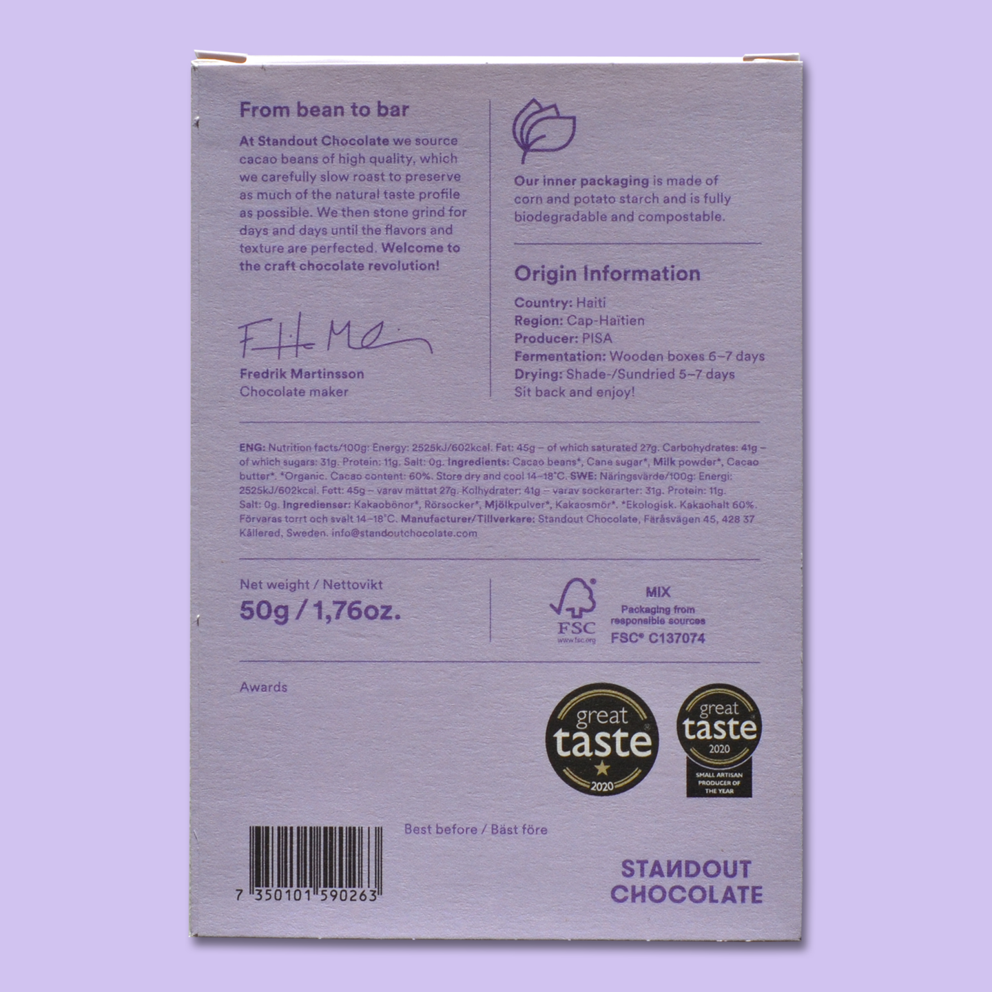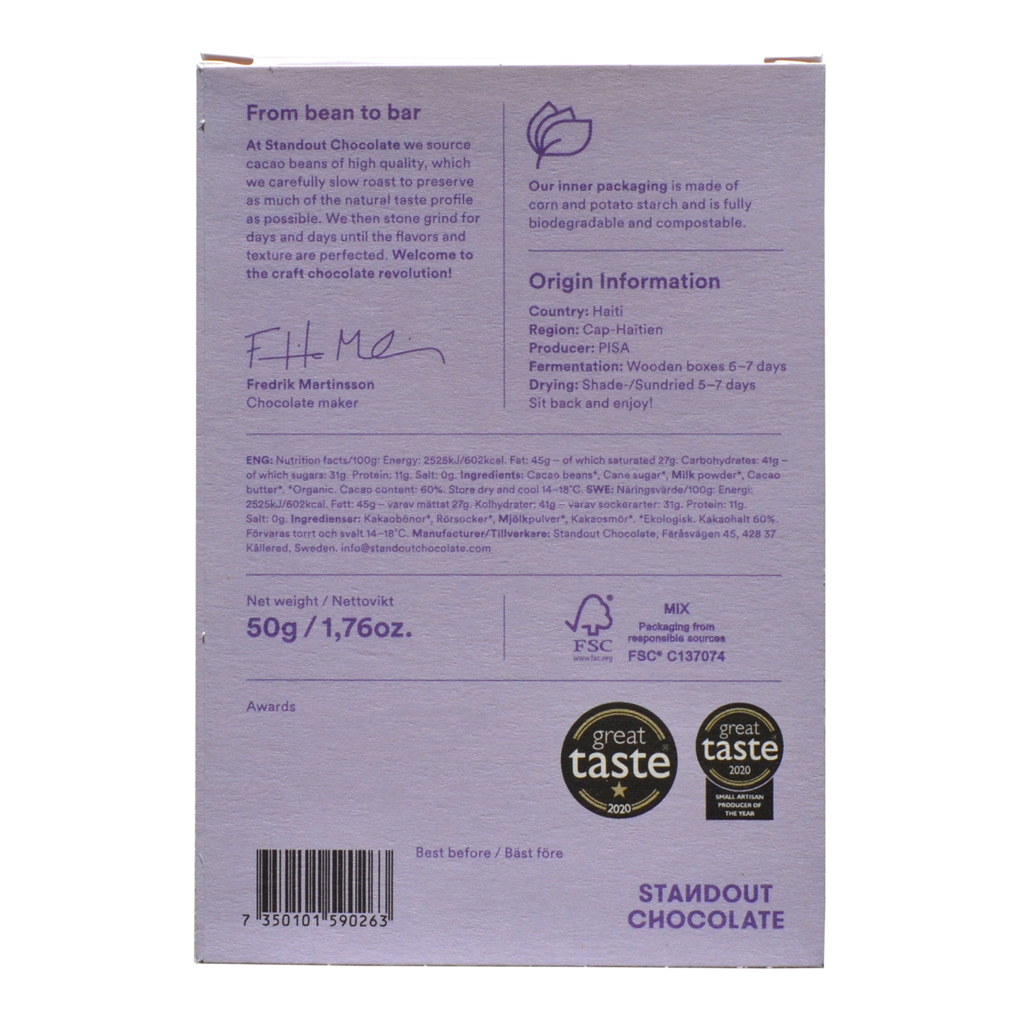 For their collection of dark milk chocolate bars, Standout Chocolate has used only the best quality single origin cacao beans, nordic milk, cacao butter and cane sugar. Giving you a bar that is full of taste, full of creaminess, yet not too sweet. Simply perfectly balanced for you to enjoy.