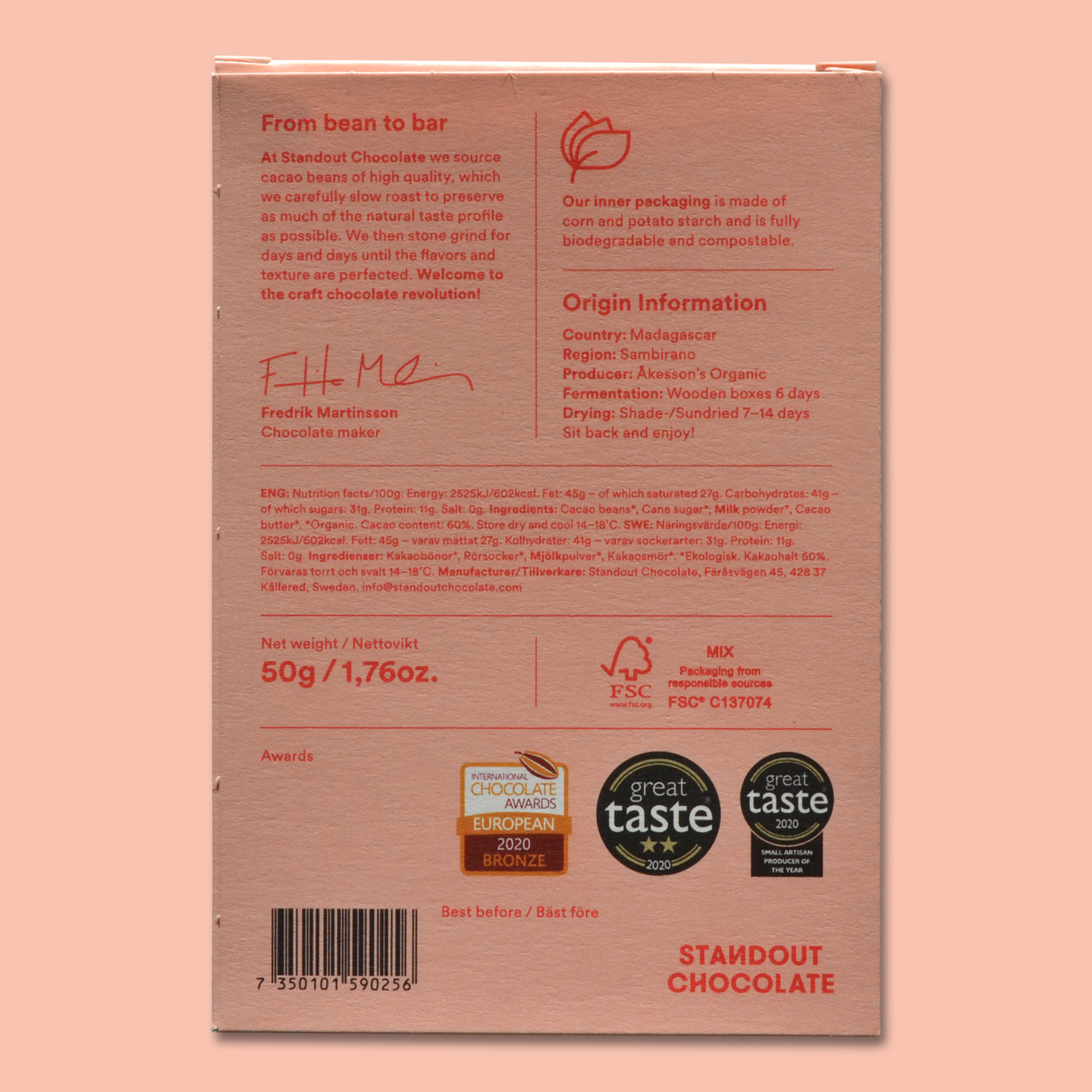 The cacao is grown in the Sambirano Valley in Madagascar on the family estate of Bertil Åkesson. The chocolate is fruity and creamy, with notes of caramel.