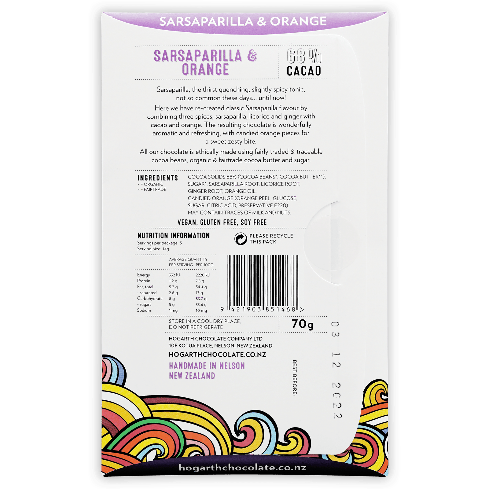 | Ingredients | Cacao Beans (Organic), Cacao Butter (Organic), Candied Orange, Cane Sugar (Organic), Ginger Root, Licorice Root, Orange Oil, Sarsaparilla Root |