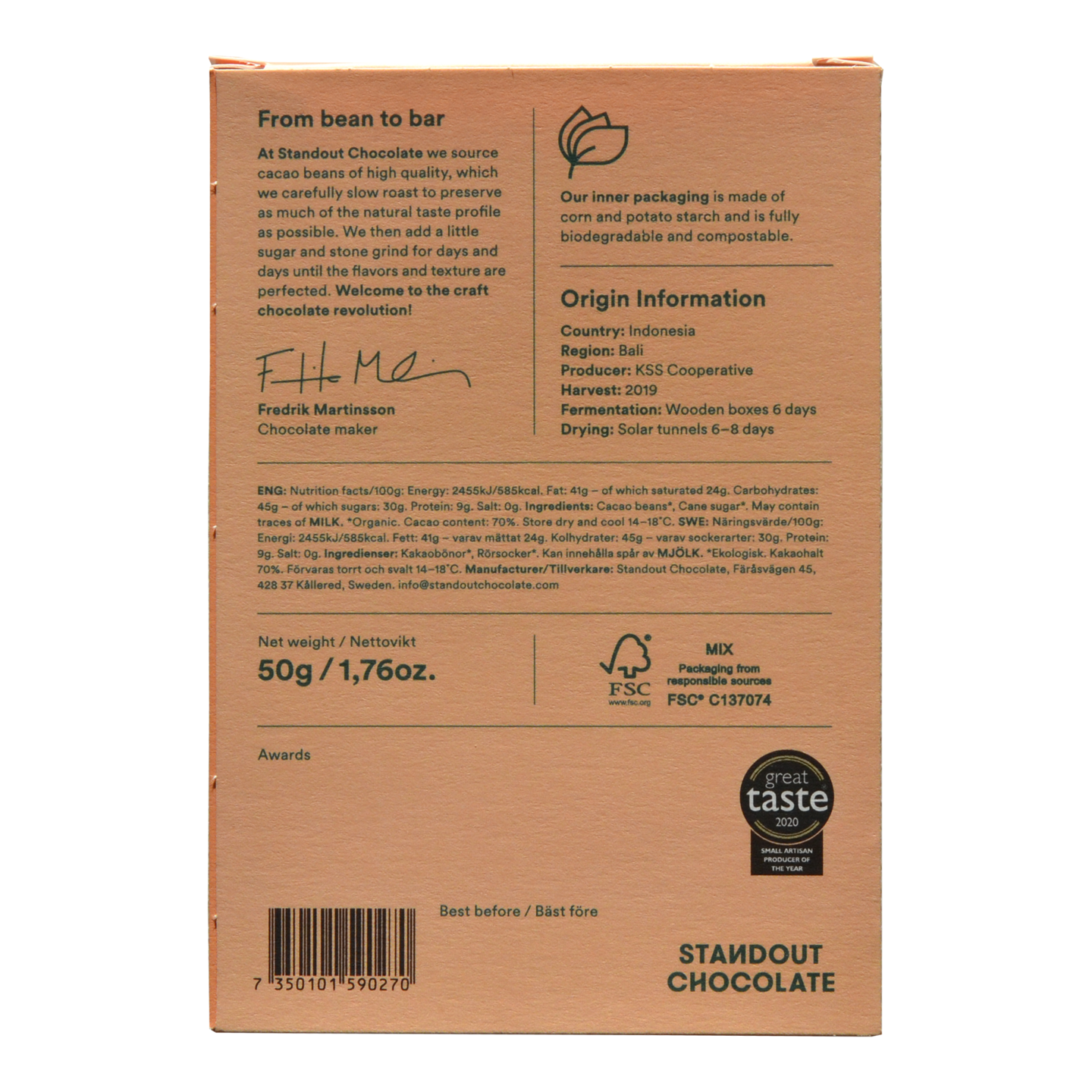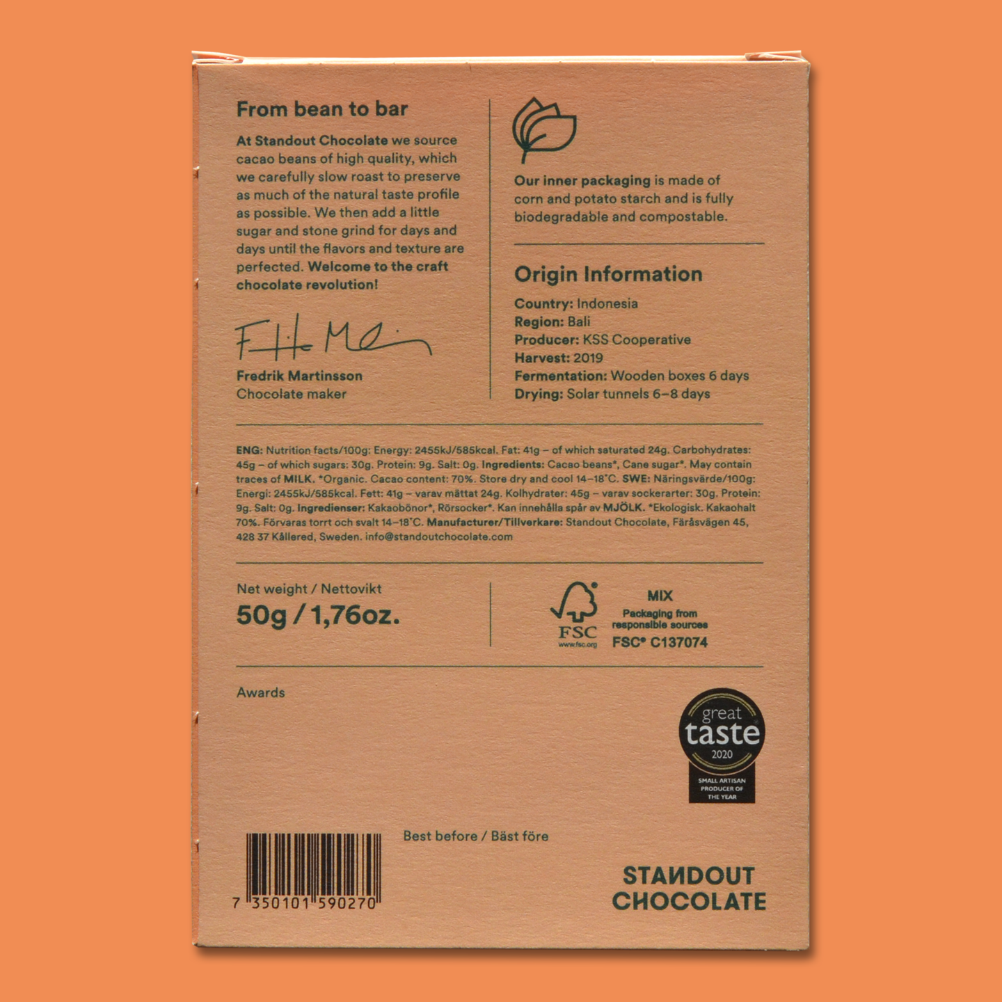 The cacao used in this bar is produced by a cooperative of approx. 600 farmers. The chocolate has a spicy flavor profile (cloves, nutmeg), with a hint of toasted bread, and a honey-like sweetness.
