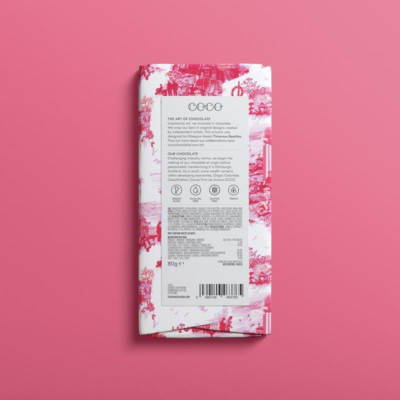 This limited edition bar, Rose & Black Pepper flavoured dark chocolate, is enveloped in an original design of the ‘Edinburgh Toile’ pattern created by Glasgow based design studio Timorous Beasties.