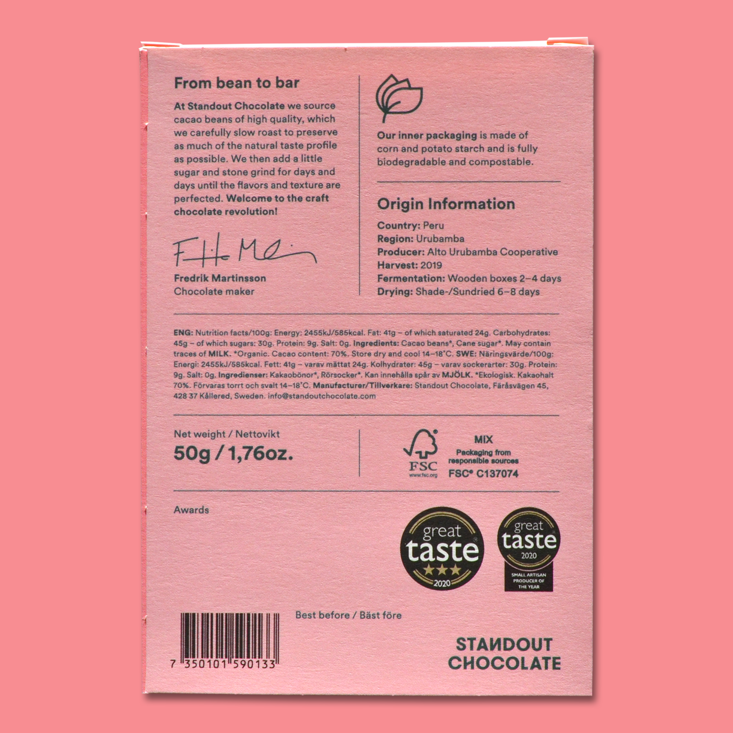 The Chuncho cacao variety used for this chocolate grow at an altitude of 1.200m, which is highly unusual for cacao. The special growing conditions gives the chocolate a unique flavour, with notes of dark fruits, floral, and blueberry.