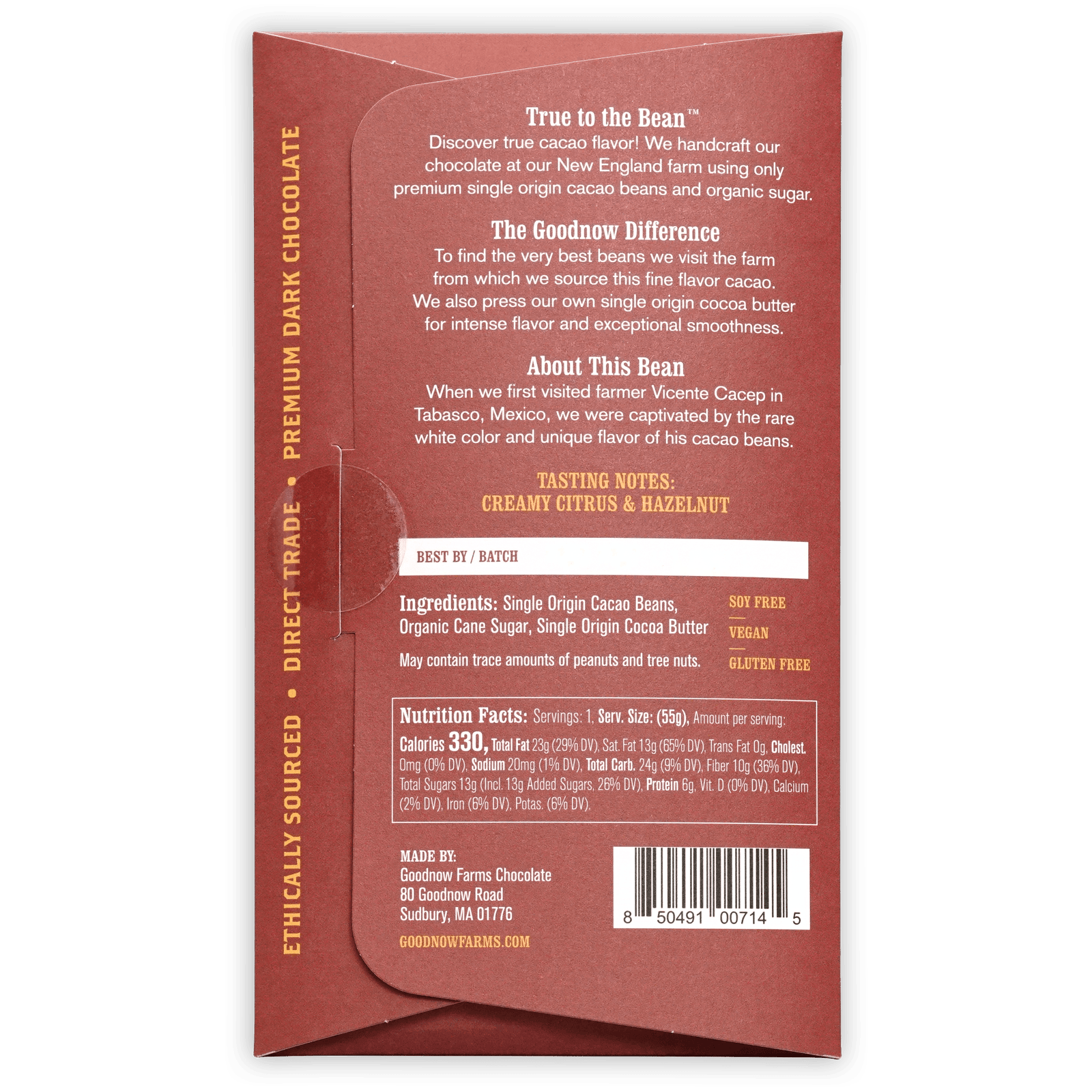 As with all of Goodnow Farms’ bars this is crafted with their house-made cocoa butter, freshly pressed from the same fine flavour beans they use to make the chocolate. Flavour notes are creamy citrus and hazelnut. Great for pairing with a sweet dessert wine.