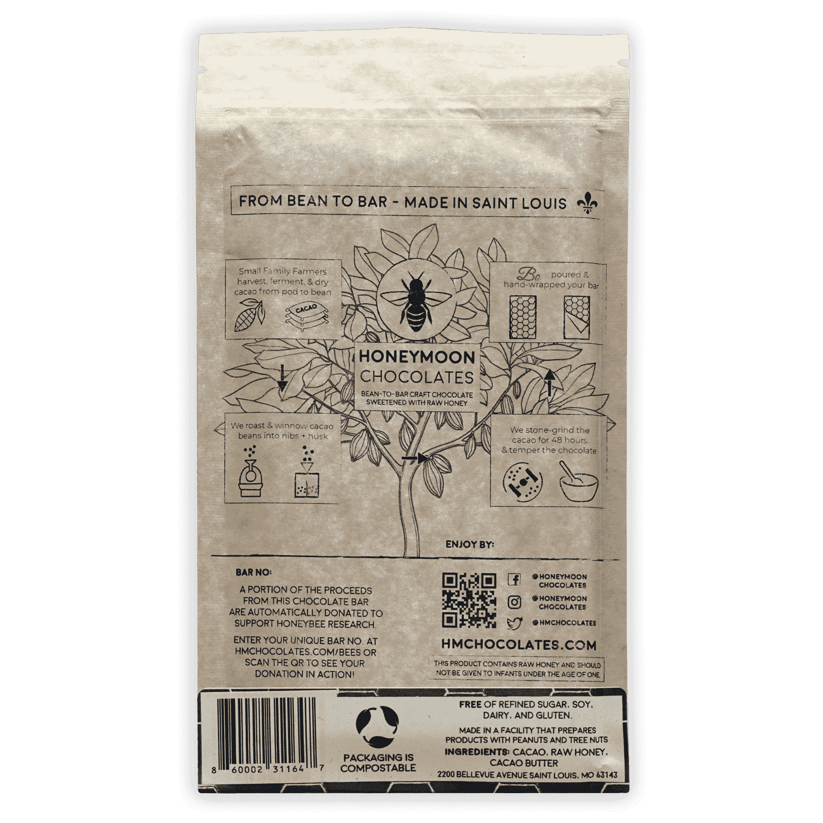 All packaging used for this 2.2 oz bar is compostable. Honeymoon pledges to make a donation with each purchase to honeybee research via The Pollinator Partnership.